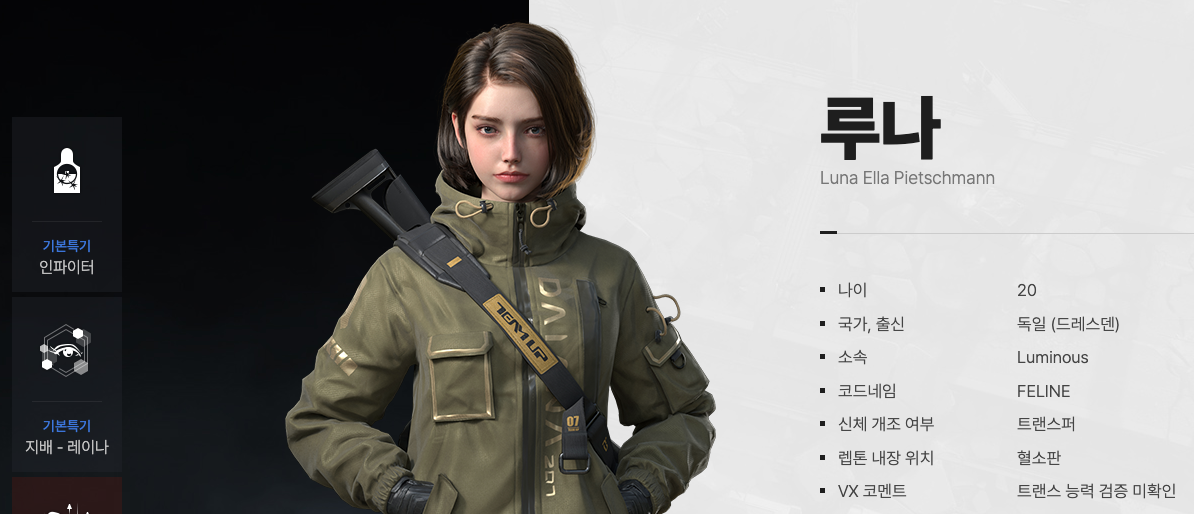 좋아요, 그래서 저 위에 나온 루나는 교통사고를 당해서 몸의 절반을 넘게 일어도 뭐 트랜스퍼를 통해서 인격을 바꾸고, 혈소판에 렙톤이 있어서 능력이 있고, 샷건을 잘 쓰고...